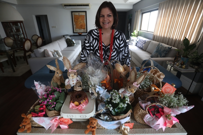 Cestas com bolsas, com balões e canecas, com coelhos. Júlia Fontelles, de 51 anos, conta que as opções são variadas de kits personalizados para a Páscoa, quando o faturamento dela chega a triplicar. Com produtos feitos individualmente, à mão, ela oferece aos clientes cestas que vão de R$ 100 a R$ 500. Ou seja, o investimento da empreendedora, que vive exclusivamente desse trabalho, é alto.