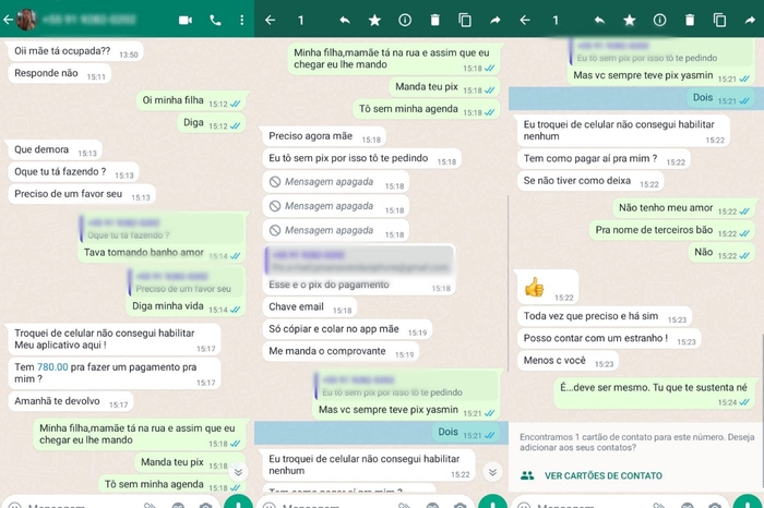 “Oi, mãe, tá ocupada? Preciso de um favor seu. Troquei de celular, não consegui habilitar meu aplicativo aqui. Tem R$ 780 pra fazer um pagamento pra mim? Amanhã te devolvo”, diz o golpista em uma das mensagens.