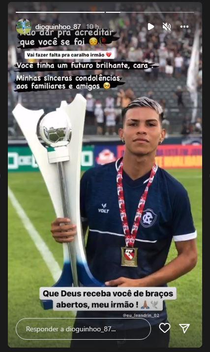 Atacante do Paysandu, Dioguinho lamenta morte do jogador do Remo: 'Tinha um futuro brilhante' Atacante bicolor se despediu do amigo nas redes sociais Fábio Will 04.07.22 12h29 Atacante Dioguinho está no Papão desde o final do ano passado (Igor Mota / O Liberal) O atacante Dioguinho, do Paysandu, utilizou a sua conta no Instagram para lamentar a morte do jogador da base do Remo, Leandro dos Reis Silva, de 19 anos, que faleceu em um acidente de transito. VEJA MAIS Jogador da base do Remo morre após acidente de moto e partida do Sub-20 é adiada O volante Leandro dos Reis Silva foi campeão Sub-20 com o Remo no ano passado Cria da base do Paysandu, jogador com passagem pelo nordeste é assassinado em Belém Jogador também atuou no Bragantino, mas não seguiu no futebol profissional. Ultimamente, Bruno Leonardo Virgínio da Silva, de 23 anos, vinha atuando no futsal e no futebol pelada Dioguinho e Leandro viviam na mesma cidade, Santa Izabel (PA) e eram próximos. Dioguinho, que já defendeu o Remo em 2020 e 2021, cita que o Leandro era uma boa pessoa e que tinha um futuro brilhante no futebol. “Não dá para acreditar que você se foi. Você tinha um futuro brilhante, cara. Minhas sinceras condolências aos familiares e amigos. Que Deus receba você de abraços abertos, meu irmão”, escreveu. O volante Leandro dos Reis Silva se envolveu em um acidente de trânsito, ontem, em Santa Izabel. Ele estava de moto, foi levado ao Hospital Metropolitano em Ananindeua, mas faleceu nesta madrugada. O jogador foi campeão paraense pelo Remo em 2021. Assine O Liberal e confira mais conteúdos e colunistas. 🗞 Entre no nosso grupo de notícias no WhatsApp e Telegram 📱 Palavras-chave esportes remo paysandu futebol jornal amazônia dioguinho COMPARTILHE ESSA NOTÍCIA Paysandu . Desculpe pela interrupção. Detectamos que você possui um bloqueador de anúncios ativo! Oferecemos notícia e informação de graça, mas produzir conteúdo de qualidade não é. Os anúncios são uma forma de garantir a receita do portal e o pagamento dos profissionais envolvidos. Por favor, desative ou remova o bloqueador de anúncios do seu navegador para continuar sua navegação sem interrupções. Obrigado! ÚLTIMAS EM PAYSANDU Re-Pa na final Na Curuzu, Paysandu vence o Castanhal e garante vaga na final do Parazão Com gol de ítalo, o Papão vai para a decisão contra o Remo em busca do 51º título 22.02.26 19h38 Futebol Presidente do Paysandu explica por que recuperação judicial tramitou em segredo: ‘estratégico’ Segundo Márcio Tuma, medida foi adotada para evitar uma possível reação em cadeia de credores. 22.02.26 16h45 Futebol 'Não é colapso', diz administrador judicial sobre recuperação do Paysandu Para especialista, medida é mecanismo legal para reestruturar dívidas e evitar agravamento da crise financeira do clube. 22.02.26 13h38 Futebol Hélio dos Anjos, Leandro Vilela e outros: veja a lista de credores do Paysandu Passivo trabalhista do clube ultrapassou a marca de R$ 10 milhões ao fim de 2025. 21.02.26 17h56 MAIS LIDAS EM ESPORTES JOGOS DE HOJE Futebol: veja quem joga hoje, domingo (22/02), horários das partidas e onde assistir ao vivo Campeonato Italiano, Bundesliga, Campeonato Espanhol e Campeonato Inglês movimentam o futebol neste domingo 22.02.26 7h00 Futebol Cametá e Remo disputam vaga na final do Parazão no Parque do Bacurau Líder da primeira fase, Mapará recebe Leão, que avançou nos pênaltis; vencedor enfrenta quem passar de Paysandu e Castanhal 22.02.26 7h00 FUTEBOL Bragantino reforça pedido de desculpas e repudia fala de atleta; FPF encaminhará caso ao TJD O Red Bull Bragantino confirmou que Daiane Muniz aceitou o pedido de desculpas 21.02.26 23h27 Futebol Hélio dos Anjos, Leandro Vilela e outros: veja a lista de credores do Paysandu Passivo trabalhista do clube ultrapassou a marca de R$ 10 milhões ao fim de 2025. 21.02.26 17h56