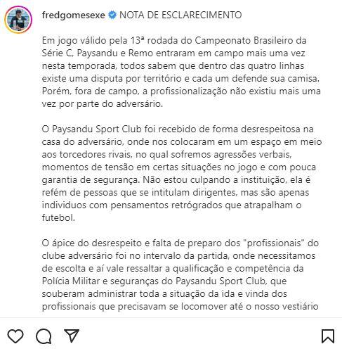 Executivo do Paysandu reclama de insegurança no Baenão e pede ética e profissionalismo ao Remo Fred Gomes utilizou a sua conta no Instagram para reclamar da forma como o staff bicolor foi tratado no Baenão Fábio Will 04.07.22 13h04 A forma como o Paysandu foi recebido no clássico não agradou à diretoria bicolor (Caio Maia/O Liberal) O clima ferveu novamente nos bastidores do clássico entre Remo x Paysandu, disputado no domingo (3), no Estádio do Baenão, de propriedade do Clube do Remo, em Belém. O executivo de futebol do Papão, Fred Gomes, reclamou da forma como o staff bicolor foi recebido no Baenão, afirmou que o local destinado ao Paysandu era inseguro e que o Remo foi antiprofissional, além de pedir ética e respeito aos adversários. VEJA MAIS Thiago Coelho: goleiro do Paysandu lamenta cânticos homofóbicos em Re-Pa: 'Não é bom para ninguém' O jovem goleiro foi alvo do preconceito de alguns torcedores e disse que atitudes como esta não cabem mais no esporte Com falha do goleiro Vinícius e jogo movimentado, Remo e Paysandu empatam pela Série C; vídeo As duas equipes fizeram um jogo intenso, com várias oportunidades de gols, que resultaram em um ponto para cada lado Lembranças de um clássico: a história do 'Verdadeiro Robgol', o último a marcar três gols em Re-Pa No início dos anos 2000, um desconhecido Robinho chegava ao Remo para marcar o nome na história do clássico mais disputado do planeta Em sua conta no Instagram, Fred Gomes falou que mais uma vez, em jogo no Baenão, não teve profissionalização da equipe do Remo, em administrar os espaços destinados aos visitantes no Baenão. Whatsapp: saiba tudo sobre o Paysandu. Recêêêba! “Em jogo válido pela 13ª rodada do Campeonato Brasileiro da Série C, Paysandu e Remo entraram em campo mais uma vez nesta temporada, todos sabem que dentro das quatro linhas existe uma disputa por território e cada um defende sua camisa. Porém, fora de campo, a profissionalização não existiu mais uma vez por parte do adversário”, publicou. Alegou falta de segurança no Baenão Fred Gomes reclamou da falta de segurança e que os dirigentes e pessoas ligadas ao staff alviceleste, foram alocadas próximo ao torcedor remista e que teve que contar com a ajuda da Polícia Militar para o deslocamento ao vestiário. “O Paysandu Sport Club foi recebido de forma desrespeitosa na casa do adversário, onde nos colocaram em um espaço em meio aos torcedores rivais, no qual sofremos agressões verbais, momentos de tensão em certas situações no jogo e com pouca garantia de segurança. Não estou culpando a instituição, ela é refém de pessoas que se intitulam dirigentes, mas são apenas indivíduos com pensamentos retrógrados que atrapalham o futebol. O ápice do desrespeito e falta de preparo dos "profissionais" do clube adversário foi no intervalo da partida, onde necessitamos de escolta e aí vale ressaltar a qualificação e competência da Polícia Militar e seguranças do Paysandu Sport Club, que souberam administrar toda a situação da ida e vinda dos profissionais que precisavam se locomover até o nosso vestiário”, escreveu. Com cerca de 700 agentes, Segup organiza esquema de segurança para o Re-Pa 766 O Clássico entre Remo e Paysandu ocorre neste domingo (3), às 17h, no Estádio do Baenão, pela Série C Duras críticas à arbitragem O executivo bicolor também criticou a arbitragem da partida e afirmou que o Paysandu foi prejudicado com lances duvidosos e que o resultado poderia ser outro. "Dentro das quatro linhas, o empate por 2 a 2 poderia se transformar numa possível vitória do Paysandu, mas em lances duvidosos, o Papão foi prejudicado até mesmo em situações fáceis de conduzir, a arbitragem teve outra interpretação. Estes erros, infelizmente, estão no dia a dia do futebol brasileiro, no entanto, o ‘maior clube do Norte’, sentiu-se prejudicado. Mas, agora é hora de concentrar as atenções no próximo adversário e buscar resultados que nos levem aos nossos objetivos”, contou. Técnico do Paysandu rebate críticas sobre baixo aproveitamento em Re-Pa: 'ganhei quando jogador' Somando passagens pelo Remo e pelo Papão, Márcio Fernandes acumula apenas uma vitória em clássicos, com 33% de aproveitamento. Remo: Justiça bloqueia 10% das rendas do Re-Pa e mais dois jogos; confira a decisão Determinação vem por dívida por um empréstimo feito pelo ex-presidente do clube, Amaro Klautau Pediu ética, respeito e responsabilidade Fred Gomes, que já foi executivo do Remo em 2015 e 2016, falou da importância do esporte e que problemas pessoais não podem interferir nas relações dos clubes. "Por fim, quero deixar bem claro que problemas pessoais não podem ser inseridos no meio do esporte, temos que agir com ética, respeito e responsabilidade até mesmo com nossos adversários. Abraços e saudações bicolores!”, finalizou. Remo A equipe de O Liberal entrou em contato com o Remo e aguarda um posicionamento do clube. Eterno Re-Pa dentro e fora de campo Essa não é a primeira vez em que dirigentes do Paysandu reclamam de como são tratados no Baenão e também na Curuzu. No Parazão e em jogos da Copa Verde de 2021, dirigentes das duas equipes trocaram farpas em seus sites reclamando da falta de “hospitalidade” no estádio adversário. Assine O Liberal e confira mais conteúdos e colunistas. 🗞 Entre no nosso grupo de notícias no WhatsApp e Telegram 📱 Palavras-chave esportes remo futebol série c paysandu executivo do paysandu fred gomes jornal amazônia baenão re-pa COMPARTILHE ESSA NOTÍCIA Paysandu . Desculpe pela interrupção. Detectamos que você possui um bloqueador de anúncios ativo! Oferecemos notícia e informação de graça, mas produzir conteúdo de qualidade não é. Os anúncios são uma forma de garantir a receita do portal e o pagamento dos profissionais envolvidos. Por favor, desative ou remova o bloqueador de anúncios do seu navegador para cont