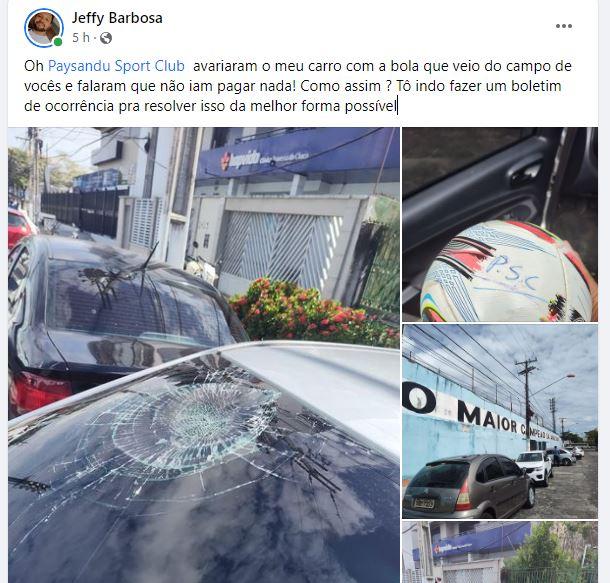 Carro tem vidro quebrado por bola do Paysandu e dono reclama: 'Não tenho como andar assim'; veja Bolada danificou o para-brisa de carro estacionado próximo a Curuzu e dono reclama de postura do clube sobre o caso O Liberal 15.07.22 16h20 Na manhã desta sexta-feira (15), um carro que estava estacionado na Travessa do Chaco, no bairro do Marco, em Belém, foi atingido por uma bola que veio da direção do Estádio da Curuzu, de propriedade do Paysandu. A bola acertou o para-brisa do veículo e danificou o carro. O dono do automóvel registrou um Boletim de Ocorrência e aguarda um posicionamento do Paysandu para arcar com o prejuízo. Whatsapp: saiba tudo sobre o Paysandu. Recêêêba! O contador Jefferson Barbosa, de 30 anos, estava acompanhando a sua esposa que está grávida, em uma clínica particular próximo ao Estádio da Curuzu. O casal estava de saída em direção ao veículo, quando uma bola atingiu o carro. Ele buscou informações com funcionários do Paysandu, mas a resposta foi negativa. “Eu tentei contato com responsáveis, o ‘gandula1’ quando saiu para pegar a bola, voltou na mesma hora e nem foi falar comigo e nem foi pegar a bola. Fui ao estádio, pediram para eu ir para um outro portão, fiquei esperando, pois minha esposa está grávida e recebi a resposta que o Lecheva iria lá comigo, mas depois o porteiro disse que não iriam pagar nada. Acionei o 190, mas como não tinha nenhuma confusão eles me aconselharam a fazer o boletim de ocorrência. Logo após levei o carro para concertar, pois não tenho como andar com o carro assim”, disse Jefferson, que informou que o valor do serviço é de R$ 850. VEJA MAIS Títulos, acessos e maior lateral artilheiro; confira os números de Pikachu por Paysandu, Vasco e Fortaleza Paraense foi destaque por onde passou e nesta semana se despediu do Tricolor do Pici para jogar no Japão Segundo melhor mandante da Série C, Paysandu tem campanha totalmente oposta fora de casa Clube bicolor venceu apenas um duelo como visitante na Terceirona Adversário do Paysandu, Vitória-BA possui atletas que passaram por Leão e Papão Equipe baiana luta por uma vaga no G8 e possui no grupo atletas que jogaram no futebol paraense Redes sociais Jefferson Barbosa postou em sua conta no Facebook fotos do carro e da bola que atingiu o seu veículo. Várias pessoas compartilharam a publicação e brincam com situação. Paysandu A equipe de O Liberal entrou em contato com o Paysandu para um posicionamento, mas, até o momento, não obteve resposta. Assine O Liberal e confira mais conteúdos e colunistas. 🗞 Entre no nosso grupo de notícias no WhatsApp e Telegram 📱 Palavras-chave esportes paysandu futebol jornal amazônia curuzu COMPARTILHE ESSA NOTÍCIA Paysandu . Desculpe pela interrupção. Detectamos que você possui um bloqueador de anúncios ativo! Oferecemos notícia e informação de graça, mas produzir conteúdo de qualidade não é. Os anúncios são uma forma de garantir a receita do portal e o pagamento dos profissionais envolvidos. Por favor, desative ou remova o bloqueador de anúncios do seu navegador para continuar sua navegação sem interrupções. Obrigado! ÚLTIMAS EM PAYSANDU Futebol Paysandu: relembre os protestos da torcida que terminaram em crise e renúncia do presidente Manifestações na Curuzu, no CT e na sede social marcaram o auge da crise política antes do pedido de recuperação judicial. 24.02.26 14h35 INVIÁVEL Paysandu deve cinco vezes mais do que o declarado na recuperação judicial No pedido aprovado pela justiça, clube declarou dívidas de pouco mais de R$ 16 mi, no entanto, totalidade de débitos chega a quase R$ 75 milhões 24.02.26 8h00 Futebol Parazão: Paysandu abre venda de ingressos para os dois jogos contra o Remo Os bilhetes da grande final custam entre R$ 50,00 e R$ 160,00 para um jogo e até R$ 280,00 para os dois jogos Re-Pa 23.02.26 17h40 FUTEBOL Enquete aponta ex-dirigentes como principais responsáveis pela crise financeira do Paysandu Papão passa por crise fora das quatro linhas e pediu Recuperação Judicial na Justiça 23.02.26 16h54 MAIS LIDAS EM ESPORTES INVIÁVEL Paysandu deve cinco vezes mais do que o declarado na recuperação judicial No pedido aprovado pela justiça, clube declarou dívidas de pouco mais de R$ 16 mi, no entanto, totalidade de débitos chega a quase R$ 75 milhões 24.02.26 8h00 JOGOS DE HOJE Futebol: veja quem joga hoje, terça-feira (24/02), horários das partidas e onde assistir ao vivo Série A saudita, Libertadores, Copa do Brasil e Champions League movimentam o futebol nesta terça-feira 24.02.26 7h00 futebol Internacional tem dúvida no setor defensivo para jogo contra o Remo Duelo, válido pela quarta rodada do Brasileirão, ocorre nesta quarta-feira (25), no Mangueirão 24.02.26 10h32 FUTEBOL Dirigente do Remo fala sobre contratações e detalha conversas com zagueiro e meia Lingard Vice-presidente do Remo, Glauber Gonçalves, explicou que existe conversas entre o clube e jogadores, mas que situação depende de uma força-tarefa 23.02.26 16h08