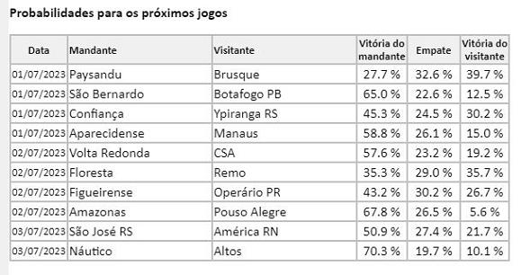 Site de estatísticas aponta derrota do Paysandu para o Brusque e vitória do Remo contra o Floresta Site 'Chance de Gol' publicou o balanço estatístico da próxima rodada da Série C e apontou revés bicolor e triunfo azulino; veja os números Fábio Will 30.06.23 10h33 Paysandu e Remo possuem jogos importantes neste final de semana pela Série C (Cristino Martins / O Liberal) Os dois representantes do Pará na Série C do Brasileiro terão jogos neste final de semana. O Paysandu terá pela frente o Brusque-SC, neste sábado (1), às 19h, na Curuzu, pela 11ª rodada do Campeonato Brasileiro da Série C. Já o Remo encara o Floresta-CE, fora de casa, no domingo (2), às 19h, no Estádio Presidente Vargas, em Fortaleza (CE). Os dois clubes querem se afastar da zona de rebaixamento, porém, o site de estatísticas “Chance de Gol”, não aponta o clube bicolor como favorito no confronto diante do Brusque, já o Remo aparece como favorito para alcançar os três pontos. No jogo diante do clube catarinense, segundo o site “Chance de Gol”, o Paysandu possui 27.7% de chances de vencer, 32.6 de ocorrer um empate e 39.7% de uma vitória do Brusque na Curuzu. A partida é considerada de “seis pontos”, já que o Brusque está na 9ª posição com 14 pontos e o Paysandu, é o primeiro clube fora da zona de rebaixamento, na 16ª colocação com 12 pontos. Em caso de vitória do Paysandu, o clube alviceleste “respira” na competição, ultrapassa o Brusque e começa a pensar em G8. VEJA MAIS De volta ao Papão, Hélio dos Anjos cita erro de Vuaden contra o Náutico: 'não vamos esquecer isso' Técnico Hélio dos Anjos desembarcou em Belém para comandar o Paysandu e relembrou o erro do árbitro Leandro Pedro Vuaden, contra o Náutico, na Série C de 2019 Líder em média de público, Remo pode perder mandos de campo na Série C 2023; entenda Remo será julgado no STJD nesta sexta-feira (30) por causa de objetos arremessados pela torcida no jogo contra o Amazonas, pela 3ª rodada da Série C Paysandu anuncia a contratação do goleiro Matheus Nogueira, que estava no futebol português Informação foi divulgada no site oficial do clube nesta quinta-feira (29). Pelo lado do Remo, o site “Chance de Gol” coloca o Leão Azul com 35.7% de chances de conquistar a vitória. O número é equilibrado, já que o Floresta aparece com 35.3% e empate com 29%. Um triunfo azulino na partida pode colocar o Remo próximo do G8. Números VEJA MAIS Jogo do Remo em Belém, pela Série C, passa por mudanças de data e horário; saiba mais Na atual edição da Terceirona, Leão não tem se dado bem como mandante Com alta rotatividade no gol, Paysandu teve apenas três goleiros ‘titulares’ nos últimos anos Apenas Emerson, Mota e Victor Souza jogaram mais de 75% dos jogos do clube numa temporada. Informações são de levantamento do OLiberal.com. Treino do Remo aponta Claudinei como provável substituto de Uchôa na Série C Camisa 4 do Leão saiu com dores no púbis na última partida e é dúvida para duelo contra o Floresta-CE, no domingo. A partida deste sábado marca o retorno do torcedor do Paysandu ao Estádio da Curuzu. O clube bicolor foi punido pelo Superior Tribunal de Justiça Desportiva (STJD), por uma confusão ocorrida na partida contra o Figueirense-SC, no ano passado, em Santa Catarina (SC) e teve que cumprir dois jogos de portões fechados, contra o São Bernardo-SC e também o Floresta-CE. Já o Remo tenta manter o bom retrospecto fora de casa, já que conquistou duas vitórias seguidas longe do seu torcedor Assine O Liberal e confira mais conteúdos e colunistas. 🗞 Entre no nosso grupo de notícias no WhatsApp e Telegram 📱 Palavras-chave esportes remo paysandu futebol jornal amazônia série c floresta brusque COMPARTILHE ESSA NOTÍCIA Paysandu . Desculpe pela interrupção. Detectamos que você possui um bloqueador de anúncios ativo! Oferecemos notícia e informação de graça, mas produzir conteúdo de qualidade não é. Os anúncios são uma forma de garantir a receita do portal e o pagamento dos profissionais envolvidos. Por favor, desative ou remova o bloqueador de anúncios do seu navegador para continuar sua navegação sem interrupções. Obrigado! ÚLTIMAS EM PAYSANDU Futebol Parazão: Paysandu abre venda de ingressos para os dois jogos contra o Remo Os bilhetes da grande final custam entre R$ 50,00 e R$ 160,00 para um jogo e até R$ 280,00 para os dois jogos Re-Pa 23.02.26 17h40 FUTEBOL Enquete aponta ex-dirigentes como principais responsáveis pela crise financeira do Paysandu Papão passa por crise fora das quatro linhas e pediu Recuperação Judicial na Justiça 23.02.26 16h54 Futebol Paysandu conhece tabela básica da Série C 2026; estreia será contra o Volta Redonda em abril CBF divulga calendário da competição, que será disputada entre 5 de abril e 25 de outubro e marca a última edição no formato atual com 20 clubes 23.02.26 16h51 futebol Roger Aguilera diz que vai retirar nome da lista de credores do Paysandu: 'Jamais irei cobrar' Ex-presidente do Papão foi citado em documento que lista dívidas do time bicolor, que está em recuperação judicial 23.02.26 13h25 MAIS LIDAS EM ESPORTES FUTEBOL Dirigente do Remo fala sobre contratações e detalha conversas com zagueiro e meia Lingard Vice-presidente do Remo, Glauber Gonçalves, explicou que existe conversas entre o clube e jogadores, mas que situação depende de uma força-tarefa 23.02.26 16h08 PROMESSAS Belém abriu o calendário nacional do tênis juvenil Reunindo atletas de várias regiões, 1ª Etapa do Nacional Juvenil 2026 reforça a presença da região Norte no calendário nacional da modalidade 24.02.26 0h21 FUTEBOL De olho na Série A, Remo exerce poder de compra e fecha a contratação de atacante Atacante Jajá estava no Goiás e desembarcou em Belém para se apresentar ao Leão Azul 23.02.26 13h15 JOGOS DE HOJE Futebol: veja quem joga hoje, terça-feira (24/02), horários das partida