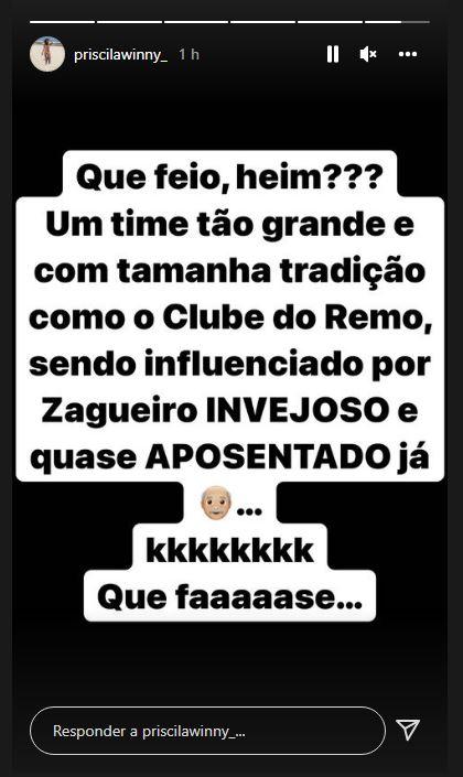 Namorada de Gedoz acusa zagueiro pela saída do meia do Remo: ‘invejoso e quase aposentado’ Remo deve anunciar ainda hoje a saída de Gedoz, após 79 partidas O Liberal 25.04.22 13h12 Gedoz namora a modelo paraense Priscila Winny (Reprodução / Redes sociais) O meia Felipe Gedoz não faz mais parte do elenco do Remo para a temporada 2022 após não comparecer ao treino antes da última partida contra o São José-RS, pela Série C, atitude que fez o técnico Paulo Bonamigo tirá-lo da relação de atletas. Porém, nas redes sociais, a namorada de Felipe Gedoz, a modelo Priscila Winny, utilizou seu Instagram e citou que o Remo está sendo influenciado por um "zagueiro velho e quase aposentado". “Que feio, heim? Um time tão grande e com uma tradição enorme como o Clube do Remo, sendo influenciado por um zagueiro invejoso e quase aposentado já, (risos), que fase”, escreveu. VEJA MAIS Conheça a princesa do Rainha das Rainhas que conquistou o coração de meia do Remo Felipe Gedoz engataou romance com paraense e, pelo visto, o prendeu no Pará; veja quem é Bonamigo cita atos de indisciplina de Gedoz no Remo e afirma: ‘Não tinha interesse de jogar a partida’ Técnico falou da situação ocorrida com Felipe Gedoz e lamentou o empate diante do São José-RS O zagueiro mais velho do Remo no atual elenco é Marlon, de 36 anos, que retornou ao Leão Azul em 2020. Marlon era lateral-esquerdo, mas desde a Série B de 2021 joga como zagueiro, é titular absoluto no clube e uma das principais lideranças do elenco dentro de campo e no vestiário. Ele é o atual capitão do time. Lateral-esquerdo do Remo revela que conversa com goleiro Vinícius foi determinante para ficar no clube Marlon disse que acreditou no projeto do clube e espera alcançar os objetivos traçados, entre eles, voltar para a Série B Priscila Winny, de 28 anos, já foi a primeira princesa do concurso Rainha das Rainhas do carnaval paraense em 2014 e coleciona títulos, como Rainha do Carnaval do Amapá em 2018, Top 5 do Miss Brasil 2014, além do Miss Amapá (2014) e Miss Pará (2011). Ela também atuou na minissérie “Dois Irmãos”, da TV Globo. Conheça todas as Rainhas das Rainhas do carnaval paraense desde 1947 Veja nomes e clubes que venceram o maior concurso de beleza do carnaval paraense Veja como foi o desfile da modelo no Miss Brasil Universo em 2014: Ver essa post no Instagram Uma publicação compartilhada por oliberal.com (@oliberal) Assine O Liberal e confira mais conteúdos e colunistas. 🗞 Entre no nosso grupo de notícias no WhatsApp e Telegram 📱 Palavras-chave esportes remo futebol felipe gedoz jornal amazônia série c marlon princesa priscila winny namorada do gedoz rainha das rainhas COMPARTILHE ESSA NOTÍCIA Remo . Desculpe pela interrupção. Detectamos que você possui um bloqueador de anúncios ativo! Oferecemos notícia e informação de graça, mas produzir conteúdo de qualidade não é. Os anúncios são uma forma de garantir a receita do portal e o pagamento dos profissionais envolvidos. Por favor, desative ou remova o bloqueador de anúncios do seu navegador para continuar sua navegação sem interrupções. Obrigado! ÚLTIMAS EM REMO FUTEBOL Dirigente do Remo fala sobre contratações e detalha conversas com zagueiro e meia Lingard Vice-presidente do Remo, Glauber Gonçalves, explicou que existe conversas entre o clube e jogadores, mas que situação depende de uma força-tarefa 23.02.26 16h08 FUTEBOL De olho na Série A, Remo exerce poder de compra e fecha a contratação de atacante Atacante Jajá estava no Goiás e desembarcou em Belém para se apresentar ao Leão Azul 23.02.26 13h15 Futebol Técnico do Remo avalia vitória contra o Cametá no Parazão e disse estar orgulhoso da equipe Treinador Juan Carlos Osorio citou a oportunidades criadas no jogo, principalmente no primeiro tempo 22.02.26 21h27 FUTEBOL Em virada nos acréscimos, Remo vence o Cametá e está na final do Parazão 2026 Leão Azul se impôs na reta final da partida e arrancou uma virada épica no Parque do Bacurau 22.02.26 19h17 MAIS LIDAS EM ESPORTES FUTEBOL Roger Aguilera, Matheus Nogueira e outros: confira a lista de credores do Paysandu Em recuperação judicial, Papão tem mais de R$ 70 milhões de dívidas 23.02.26 12h31 FUTEBOL De olho na Série A, Remo exerce poder de compra e fecha a contratação de atacante Atacante Jajá estava no Goiás e desembarcou em Belém para se apresentar ao Leão Azul 23.02.26 13h15 futebol Roger Aguilera diz que vai retirar nome da lista de credores do Paysandu: 'Jamais irei cobrar' Ex-presidente do Papão foi citado em documento que lista dívidas do time bicolor, que está em recuperação judicial 23.02.26 13h25 CLÁSSICO PARAENSE Quando é o próximo Re-Pa? Veja as datas da final do Parazão 2026 Clássico entre Remo e Paysandu volta a decidir o estadual no Estádio do Mangueirão 23.02.26 8h57