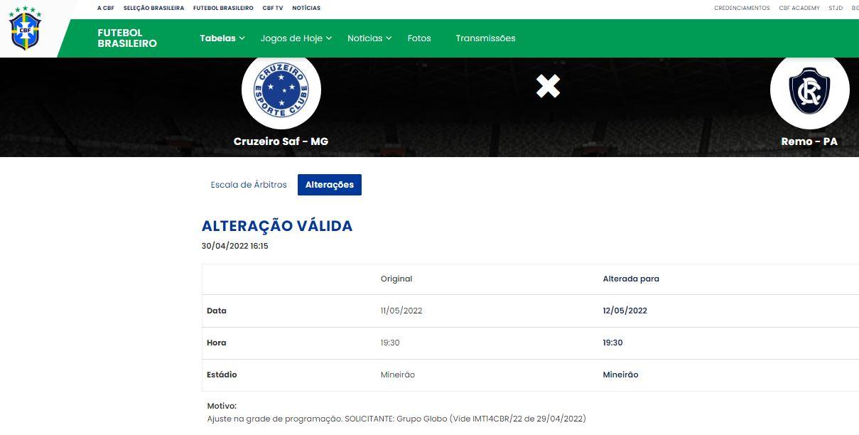 Globo pede e jogo Cruzeiro x Remo pela Copa do Brasil sofre alteração; partida pode mudar de local Partida mudou de data e poderá mudar de local nos próximos dias, já que data coincide com show da banda de rock Metallica no Mineirão Fabio Will 02.05.22 14h17 Leão Azul venceu o primeiro jogo por 2 a 1 e possui a vantagem do empate para seguir na competição (Thiago Gomes / O Liberal) A Confederação Brasileira de Futebol (CBF) modificou a data da partida de volta entre Cruzeiro-MG x Remo, pela terceira fase da Copa do Brasil 2022. O jogo que estava marcado para a terça-feira (11), passou para a quarta-feira (12), com o horário de 19h30 mantido. O jogo continua marcado para o Estádio do Mineirão, na cidade de Belo Horizonte (MG), porém, uma nova modificação deverá ser feita pela instituição que comanda o futebol nacional, já que a data coincide com o show da banda de rock Metallica, que está marcado para acontecer também no Mineirão. Whatsapp: saiba tudo sobre o Remo. Recêêêba! A mudança na data foi publicada no site oficial da CBF, após solicitação do Grupo Globo, que detém os direitos de transmissão, para realizar ajustes na grade programação. O Clube do Remo venceu o primeiro jogo disputado no Baenão, em Belém, pelo placar de 2 a 1, de virada. Com a vitória o clube paraense conquistou a vantagem de jogar pelo empate para garantir a classificação para as oitavas de final. Já o Cruzeiro, que hoje é administrado pelo ídolo Ronaldo Fenômeno, precisa vencer por dois gols de diferença para ficar com a vaga de forma direta. Caso o clube mineiro vença a partida por um gol de diferença, a vaga será decidida nas cobranças de pênaltis. VEJA MAIS Narrador se incomoda com tabu do Remo contra o Cruzeiro e diz: 'Impressionante como é freguês' O Remo venceu mais uma diante do Cruzeiro, dessa vez em um confronto inédito pela Copa do Brasil Ex-árbitro, comentarista diz que os dois gols do Remo contra o Cruzeiro foram irregulares Sandro Meira Ricci analisou os lances e concluiu que houve falha da arbitragem Nas redes sociais, Cruzeiro reclama dos gols do Remo no jogo de ida da Copa do Brasil; confira Leão Azul venceu a partida disputada no Baenão e garantiu a vantagem mínima para o jogo de volta O Cruzeiro é o maior detentor de títulos da Copa do Brasil com seis conquistas, já o Remo o máximo que cegou na competição nacional foi na semifinal de 1991, quando foi eliminado pelo Criciúma-SC. Mas no retrospecto do confronto entre Leão e Raposa, o clube paraense não perde para o Cruzeiro desde 1979, há quase 43 anos, 3 a 0 pelo Brasileiro-Copa Brasil. Assine O Liberal e confira mais conteúdos e colunistas. 🗞 Entre no nosso grupo de notícias no WhatsApp e Telegram 📱 Palavras-chave esportes remo cruzeiro futebol copa do brasil jornal amazônia COMPARTILHE ESSA NOTÍCIA Remo . Desculpe pela interrupção. Detectamos que você possui um bloqueador de anúncios ativo! Oferecemos notícia e informação de graça, mas produzir conteúdo de qualidade não é. Os anúncios são uma forma de garantir a receita do portal e o pagamento dos profissionais envolvidos. Por favor, desative ou remova o bloqueador de anúncios do seu navegador para continuar sua navegação sem interrupções. Obrigado! ÚLTIMAS EM REMO PARAZÃO Patrick de Paula fala sobre gol salvador que colocou Remo na final: 'único na minha vida' Jogador marcou um golaço nos acréscimos e sacramentou a virada remista contra o Cametá 23.02.26 20h57 FUTEBOL Dirigente do Remo fala sobre contratações e detalha conversas com zagueiro e meia Lingard Vice-presidente do Remo, Glauber Gonçalves, explicou que existe conversas entre o clube e jogadores, mas que situação depende de uma força-tarefa 23.02.26 16h08 FUTEBOL De olho na Série A, Remo exerce poder de compra e fecha a contratação de atacante Atacante Jajá estava no Goiás e desembarcou em Belém para se apresentar ao Leão Azul 23.02.26 13h15 Futebol Técnico do Remo avalia vitória contra o Cametá no Parazão e disse estar orgulhoso da equipe Treinador Juan Carlos Osorio citou a oportunidades criadas no jogo, principalmente no primeiro tempo 22.02.26 21h27 MAIS LIDAS EM ESPORTES JOGOS DE HOJE Futebol: veja quem joga hoje, terça-feira (24/02), horários das partidas e onde assistir ao vivo Série A saudita, Libertadores, Copa do Brasil e Champions League movimentam o futebol nesta terça-feira 24.02.26 7h00 FUTEBOL Dirigente do Remo fala sobre contratações e detalha conversas com zagueiro e meia Lingard Vice-presidente do Remo, Glauber Gonçalves, explicou que existe conversas entre o clube e jogadores, mas que situação depende de uma força-tarefa 23.02.26 16h08 INVIÁVEL Paysandu deve cinco vezes mais do que o declarado na recuperação judicial No pedido aprovado pela justiça, clube declarou dívidas de pouco mais de R$ 16 mi, no entanto, totalidade de débitos chega a quase R$ 75 milhões 24.02.26 8h00 PROMESSAS Belém abriu o calendário nacional do tênis juvenil Reunindo atletas de várias regiões, 1ª Etapa do Nacional Juvenil 2026 reforça a presença da região Norte no calendário nacional da modalidade 24.02.26 0h21