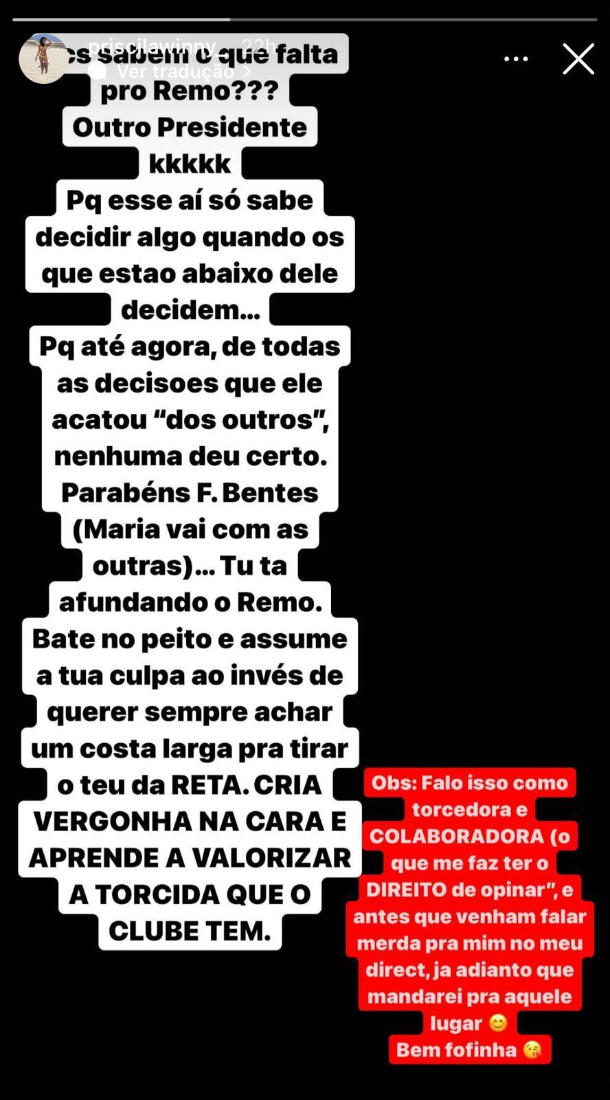 Namorada de Gedoz critica postura de presidente do Remo e chama Bentes de 'Maria vai com as outras' Priscila Winny publicou em seu story no Instagram críticas à gestão de Fábio Bentes à frente do Remo O Liberal 12.07.22 18h28 Priscila Winny é namorada de Gedoz, ex-camisa 10 do Remo (Arquivo pessoal) Após polêmica na saída do meia Felipe Gedoz, em que a namorada do ex-camisa 10 azulino, Priscila Winny, chamou o jogador Marlon de “invejoso e quase aposentado” e dele ser um dos “culpados” pela saída de Gedoz do Remo, ganhou mais um capítulo nesta terça-feira (12). Dessa vez Priscila Winny direcionou críticas à administração do presidente do Remo, Fábio Bentes. Whatsapp: saiba tudo sobre o Remo. Recêêêba! Torcedora do Remo, Priscila Winny afirmou em seu story no Instagram, que Fábio Bentes não decide nada e que tudo é articulado por pessoas que estão abaixo do poder e que suas decisões nenhuma deu certo até então. “Vocês sabem o que falta pro Remo? Outro presidente (risos). Porque esse aí (Fábio Bentes) só sabe decidir algo quando os que estão abaixo dele decidem. Porque até agora, de todas as decisões que ele acatou ‘dos outros’, nenhuma deu certo”, escreveu. VEJA MAIS Namorada de Gedoz acusa zagueiro pela saída do meia do Remo: ‘invejoso e quase aposentado’ Remo deve anunciar ainda hoje a saída de Gedoz, após 79 partidas Conheça a princesa do Rainha das Rainhas que conquistou o coração de meia do Remo Felipe Gedoz engataou romance com paraense e, pelo visto, o prendeu no Pará; veja quem é Ex-mulher cobrando pensão, 'pelada' com os amigos e pagode no AP; confira as polêmicas de Gedoz no Remo Jogador conquistou títulos, mas também colecionou problemas extracampo Priscila Winny chamou o presidente azulino de “Maria vai com as outras” e afirmou que ele não assume a culpa e que tenta colocar a culpa em outras pessoas. “Parabéns, Fábio Bentes ‘Maria vai com as outras’, tu tá afundando o Remo. Bate no peito e assume a tua culpa ao invés de querer sempre achar um costa larga para tirar o teu da reta. Cria vergonha na cara e aprende a valorizar a torcida que o clube tem”, publicou. No final, Priscila Winny deu um aviso aos seguidores que torcem para o Remo que costumam mandar mensagens em seu direct no Instagram. “Falo isso como torcedora e como colaboradora, o que me faz ter o direito de opinar. E antes que venham falar merda pra mim, no meu direct, já adianto que mandarei para aquele lugar”, finalizou. A equipe de O Liberal entrou em contato com o presidente azulino, Fábio Bentes, mas até o momento não obteve resposta. Assine O Liberal e confira mais conteúdos e colunistas. 🗞 Entre no nosso grupo de notícias no WhatsApp e Telegram 📱 Palavras-chave esportes remo futebol fábio bentes felipe gedoz priscila winny série c jornal amazônia COMPARTILHE ESSA NOTÍCIA Remo . Desculpe pela interrupção. Detectamos que você possui um bloqueador de anúncios ativo! Oferecemos notícia e informação de graça, mas produzir conteúdo de qualidade não é. Os anúncios são uma forma de garantir a receita do portal e o pagamento dos profissionais envolvidos. Por favor, desative ou remova o bloqueador de anúncios do seu navegador para continuar sua navegação sem interrupções. Obrigado! ÚLTIMAS EM REMO FUTEBOL Dirigente do Remo fala sobre contratações e detalha conversas com zagueiro e meia Lingard Vice-presidente do Remo, Glauber Gonçalves, explicou que existe conversas entre o clube e jogadores, mas que situação depende de uma força-tarefa 23.02.26 16h08 FUTEBOL De olho na Série A, Remo exerce poder de compra e fecha a contratação de atacante Atacante Jajá estava no Goiás e desembarcou em Belém para se apresentar ao Leão Azul 23.02.26 13h15 Futebol Técnico do Remo avalia vitória contra o Cametá no Parazão e disse estar orgulhoso da equipe Treinador Juan Carlos Osorio citou a oportunidades criadas no jogo, principalmente no primeiro tempo 22.02.26 21h27 FUTEBOL Em virada nos acréscimos, Remo vence o Cametá e está na final do Parazão 2026 Leão Azul se impôs na reta final da partida e arrancou uma virada épica no Parque do Bacurau 22.02.26 19h17 MAIS LIDAS EM ESPORTES FUTEBOL Roger Aguilera, Matheus Nogueira e outros: confira a lista de credores do Paysandu Em recuperação judicial, Papão tem mais de R$ 70 milhões de dívidas 23.02.26 12h31 CLÁSSICO PARAENSE Quando é o próximo Re-Pa? Veja as datas da final do Parazão 2026 Clássico entre Remo e Paysandu volta a decidir o estadual no Estádio do Mangueirão 23.02.26 8h57 Futebol Remo volta a encarar o Internacional-RS em Belém após quase dez anos; relembre Na ocasião, o Colorado venceu por 2 a 1, no antigo Mangueirão. 22.02.26 9h00 FUTEBOL De olho na Série A, Remo exerce poder de compra e fecha a contratação de atacante Atacante Jajá estava no Goiás e desembarcou em Belém para se apresentar ao Leão Azul 23.02.26 13h15