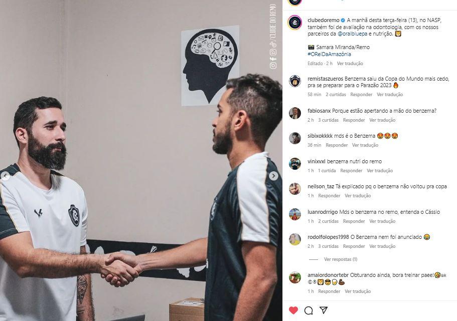 Benzema no Remo? Torcedores do Leão chamam nutricionista de Benzema em publicação nas redes sociais Nutricionista do Remo, Caio Paiva, foi chamado de "Benzema" por vários torcedores do Leão Azul O Liberal 13.12.22 17h26 Caio Paiva (à esquerda) foi alvo de brincadeiras de torcedores do Remo no Instagram (Samara Miranda / Remo - RUBEN ALBARRAN / DIA ESPORTIVO / AE) O Remo segue no segundo dia de preparação dos atletas para a temporada 2023. O jogadores do Leão tiveram nesta terça-feira (13), uma avaliação com o nutricionista do clube, Caio Paiva, que virou a “sensação” dos torcedores azulinos no Instagram, que o chamaram de “Benzema”, atacante do Real Madrid e da Seleção Francesa. Ver essa post no Instagram Uma publicação compartilhada por oliberal.com (@oliberal) VEJA MAIS Remo contrata auxiliar permanente Fábio Cortez, ex-Vasco e Netão pode deixar o clube; saiba mais Depois de anunciar a chegada do ex-jogador e ídolo Agnaldo de Jesus para o cargo de coordenador técnico, Leão fecha com Fábio Cortez para ser o auxiliar permanente do clube Ministério Público pede prisão do atacante Leandro Carvalho, ex-Remo e Paysandu; entenda o caso Processo judicial movido por mãe de uma das filhas do jogador pede o pagamento de sete meses de pensão alimentícia atrasada, dívida que pode chegar a R$ 50 mil Remo apresenta ídolo Agnaldo de Jesus, o Seu Boneco, como novo coordenador técnico Agnaldo assume a vaga no lugar de João Galvão, que deixou o cargo após o fracasso na Série C Caio Paiva aparece em uma foto postada pela assessoria do clube, apertando a mão do jogador Pedro Sena, no Núcleo Azulino de Saúde e Performance (NASP). Na publicação vários torcedores do Remo falaram da semelhança do nutricionista com o atacante do Real Madrid, que foi cortado da Copa do Mundo do Catar, após contusão. A publicação Leia os comentários “O Benzema saiu da Copa do Mundo mais cedo para se preparar para o Parazão 2023 – Perfil “Remista Zueros” “Porque estão apertando a mão do Benzema?” – Fábio Sanches “Benzema nutri do Remo” – Vinícius Scerni “Meu Deus é o Benzema” – Marllon Malcher “O Benzema nem foi anunciado” – Rodolfo Lopes Assine O Liberal e confira mais conteúdos e colunistas. 🗞 Entre no nosso grupo de notícias no WhatsApp e Telegram 📱 Palavras-chave esportes remo benzema futebol jornal amazônia COMPARTILHE ESSA NOTÍCIA Remo . Desculpe pela interrupção. Detectamos que você possui um bloqueador de anúncios ativo! Oferecemos notícia e informação de graça, mas produzir conteúdo de qualidade não é. Os anúncios são uma forma de garantir a receita do portal e o pagamento dos profissionais envolvidos. Por favor, desative ou remova o bloqueador de anúncios do seu navegador para continuar sua navegação sem interrupções. Obrigado! ÚLTIMAS EM REMO FUTEBOL Dirigente do Remo fala sobre contratações e detalha conversas com zagueiro e meia Lingard Vice-presidente do Remo, Glauber Gonçalves, explicou que existe conversas entre o clube e jogadores, mas que situação depende de uma força-tarefa 23.02.26 16h08 FUTEBOL De olho na Série A, Remo exerce poder de compra e fecha a contratação de atacante Atacante Jajá estava no Goiás e desembarcou em Belém para se apresentar ao Leão Azul 23.02.26 13h15 Futebol Técnico do Remo avalia vitória contra o Cametá no Parazão e disse estar orgulhoso da equipe Treinador Juan Carlos Osorio citou a oportunidades criadas no jogo, principalmente no primeiro tempo 22.02.26 21h27 FUTEBOL Em virada nos acréscimos, Remo vence o Cametá e está na final do Parazão 2026 Leão Azul se impôs na reta final da partida e arrancou uma virada épica no Parque do Bacurau 22.02.26 19h17 MAIS LIDAS EM ESPORTES FUTEBOL Roger Aguilera, Matheus Nogueira e outros: confira a lista de credores do Paysandu Em recuperação judicial, Papão tem mais de R$ 70 milhões de dívidas 23.02.26 12h31 FUTEBOL De olho na Série A, Remo exerce poder de compra e fecha a contratação de atacante Atacante Jajá estava no Goiás e desembarcou em Belém para se apresentar ao Leão Azul 23.02.26 13h15 futebol Roger Aguilera diz que vai retirar nome da lista de credores do Paysandu: 'Jamais irei cobrar' Ex-presidente do Papão foi citado em documento que lista dívidas do time bicolor, que está em recuperação judicial 23.02.26 13h25 CLÁSSICO PARAENSE Quando é o próximo Re-Pa? Veja as datas da final do Parazão 2026 Clássico entre Remo e Paysandu volta a decidir o estadual no Estádio do Mangueirão 23.02.26 8h57