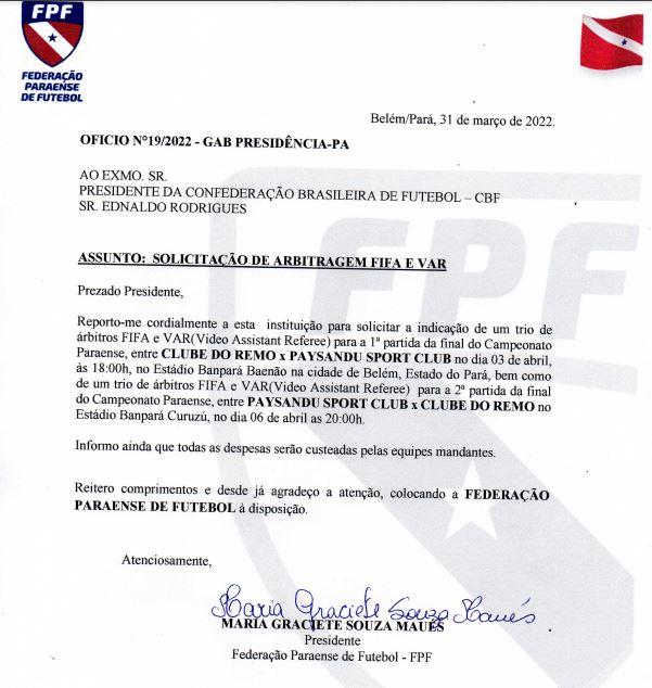 FPF divulga documento e secretário explica veto da CBF para o VAR nas finais do Parazão Secretário geral da FPF, Maurício Bororó, informou os motivos da não utilização do VAR e explicou que a FPF realizou a solicitação Fabio Will 01.04.22 13h11 FPF precisa amparar o seu profissional (Akira Onuma/ Arquivo O Liberal) Remo e Paysandu decidem o Parazão 2022 e os dois clubes solicitaram o árbitro de vídeo (VAR), porém, as duas finais não terão o auxílio da tecnologia. A Federação Paraense de Futebol chegou a solicitar à Confederação Brasileira de Futebol (CBF), mas teve o seu pedido negado. A FPF publicou em seu site oficial o documento pedindo à CBF o VAR. VEJA MAIS Remo e Paysandu pedem, mas finais do Parazão não terão VAR, diz presidente da Comissão de Arbitragem Lúcio Ipojucan, presidente da Comissão de Arbitragem da FPF, informou que não há tempo hábil para que a solicitação do VAR seja atendida Para as finais contra o Remo, Paysandu solicita VAR e trio arbitragem de fora do Estado Presidente do Papão, Maurício Ettinger, confirmou o pedido à FPF em parceria com o Remo Remo emite nota e pede VAR e arbitragem FIFA à FPF para as finais do Parazão contra o Paysandu Em nota no site oficial do clube, Remo alega preocupação com os erros de arbitragens que ocorreram em seus jogos e em outras partidas do Parazão Em contato com o secretário geral da FPF, Maurício Bororó, o VAR foi solicitado, mas esbarrou no tempo hábil para a logística de transporte de equipamentos e instalações, já que o aparelho só pode ser instalado por empresas prestadoras de serviço à CBF. Como o Parazão não possui no regulamento a utilização do VAR, foi negado pela CBF. “A Federação fez o ofício à CBF, a presidente Dona Graciete Maués atendeu os pedidos dos clubes, mas a CBF não liberou o VAR, alegando falta do tempo hábil. Existe toda uma preparação para que se tenha VAR como solicitação da empresa credenciada à CBF (via própria CBF) para a instalação. Por essa situação é necessário um pedido com 30 a 60 dias de antecedência, já que o Campeonato Paraense não possui VAR. Que isso fique bem claro, não foi a FPF quem vetou o VAR”, explicou, Maurício Bororó. Documento da FPF solicitando VAR Presidentes do Leão e do Papão solicitaram arbitragem FIFA e o VAR para as duas partidas que decidirão o Campeonato Paraense 2022, após vários erros cometidos pela arbitragem local em partidas do Parazão. O primeiro jogo da decisão será no domingo (3), às 18h, no Baenão e a segunda partida será na quarta-feira (6), às 20h, na Curuzu. Os jogos serão transmitidos lance a lance com fotos e vídeos no OLiberal.com. Assine O Liberal e confira mais conteúdos e colunistas. 🗞 Entre no nosso grupo de notícias no WhatsApp e Telegram 📱 Palavras-chave esportes remo paysandu fpf jornal amazônia var COMPARTILHE ESSA NOTÍCIA Futebol . Desculpe pela interrupção. Detectamos que você possui um bloqueador de anúncios ativo! Oferecemos notícia e informação de graça, mas produzir conteúdo de qualidade não é. Os anúncios são uma forma de garantir a receita do portal e o pagamento dos profissionais envolvidos. Por favor, desative ou remova o bloqueador de anúncios do seu navegador para continuar sua navegação sem interrupções. Obrigado! ÚLTIMAS EM FUTEBOL Futebol Com participantes definidos, FPF divulga datas e horários da fase final da Copa Grão-Pará; veja Após a rodada que definiu os finalistas do Parazão, mais dois times foram garantidos na segunda semifinal da competição paralela ao estadual 23.02.26 16h27 Campeonato Inglês Everton x United: onde assistir ao vivo e as escalações do jogo de hoje (23/02) pela Premier League Everton e Manchester United jogam pelo Campeonato Inglês hoje; veja onde assistir ao vivo e as formações da partida 23.02.26 16h00 Campeonato Espanhol Alavés x Girona: onde assistir ao vivo e as escalações do jogo de hoje (23/02) por La Liga Alavés e Girona jogam pelo Campeonato Espanhol hoje; veja onde assistir ao vivo e as formações da partida 23.02.26 16h00 Série A italiana Bologna x Udinese: onde assistir ao vivo e escalações do jogo hoje (23/02) pelo Campeonato Italiano Bologna e Udinese jogam pela Série A italiana hoje; veja onde assistir ao vivo e as formações da partida 23.02.26 15h45 MAIS LIDAS EM ESPORTES FUTEBOL De olho na Série A, Remo exerce poder de compra e fecha a contratação de atacante Atacante Jajá estava no Goiás e desembarcou em Belém para se apresentar ao Leão Azul 23.02.26 13h15 PROMESSAS Belém abriu o calendário nacional do tênis juvenil Reunindo atletas de várias regiões, 1ª Etapa do Nacional Juvenil 2026 reforça a presença da região Norte no calendário nacional da modalidade 24.02.26 0h21 Futebol Paysandu conhece tabela básica da Série C 2026; estreia será contra o Volta Redonda em abril CBF divulga calendário da competição, que será disputada entre 5 de abril e 25 de outubro e marca a última edição no formato atual com 20 clubes 23.02.26 16h51 PARAZÃO Patrick de Paula fala sobre gol salvador que colocou Remo na final: 'único na minha vida' Jogador marcou um golaço nos acréscimos e sacramentou a virada remista contra o Cametá 23.02.26 20h57