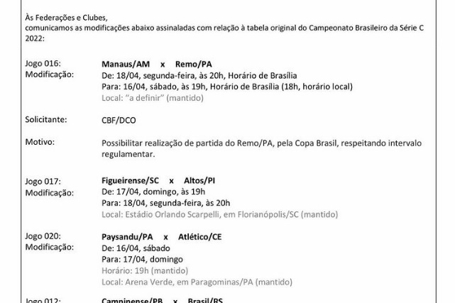CBF altera jogos de Remo e Paysandu na Série C; saiba mais A entidade organizadora da Série C alterou quatro partidas, duas delas envolvendo Clube do Remo e Paysandu Luiz Guilherme Ramos 05.04.22 21h21 Comunicado foi divulgado pela entidade nesta terça-feira. (Divulgação) A Confederação Brasileira de Futebol divulgou nesta terça-feira em sua página oficial, uma alteração nas partidas válidas pela Série C do Campeonato Brasileiro. Clube do Remo e Paysandu tiveram jogos alterados. A princípio, conforme tabela oficial, o confronto entre Manaus e Remo, marcado para o dia 18 de abril (segunda-feira), às 20 horas, foi transferido para o dia 16, sábado, às 19 horas, horário de Brasília. O local segue indefinido. Já o duelo entre Paysandu e Atlético-CE, agendado para o dia 16, sábado, foi remarcado no domingo seguinte (17), no mesmo horário e local, o estádio Arena Verde, em Paragominas. (Divulgação / CBF) As outras duas mudanças aconteceram nos jogos entre Figueirense-SC e Altos-PI, que sai do dia 17 de abril pára o dia 18, no estádio Orlando Scarpelli, em Santa Catarina, e Campinense-PB e Brasil-RS, que jogam dia 17 de abril, mas com início às 17 horas, e não 18, como previsto. Assine O Liberal e confira mais conteúdos e colunistas. 🗞 Entre no nosso grupo de notícias no WhatsApp e Telegram 📱 Palavras-chave futebol brasileiro série c remo paysandu jornal amazônia COMPARTILHE ESSA NOTÍCIA Futebol . Desculpe pela interrupção. Detectamos que você possui um bloqueador de anúncios ativo! Oferecemos notícia e informação de graça, mas produzir conteúdo de qualidade não é. Os anúncios são uma forma de garantir a receita do portal e o pagamento dos profissionais envolvidos. Por favor, desative ou remova o bloqueador de anúncios do seu navegador para continuar sua navegação sem interrupções. Obrigado! ÚLTIMAS EM FUTEBOL Futebol Com participantes definidos, FPF divulga datas e horários da fase final da Copa Grão-Pará; veja Após a rodada que definiu os finalistas do Parazão, mais dois times foram garantidos na segunda semifinal da competição paralela ao estadual 23.02.26 16h27 Campeonato Inglês Everton x United: onde assistir ao vivo e as escalações do jogo de hoje (23/02) pela Premier League Everton e Manchester United jogam pelo Campeonato Inglês hoje; veja onde assistir ao vivo e as formações da partida 23.02.26 16h00 Campeonato Espanhol Alavés x Girona: onde assistir ao vivo e as escalações do jogo de hoje (23/02) por La Liga Alavés e Girona jogam pelo Campeonato Espanhol hoje; veja onde assistir ao vivo e as formações da partida 23.02.26 16h00 Série A italiana Bologna x Udinese: onde assistir ao vivo e escalações do jogo hoje (23/02) pelo Campeonato Italiano Bologna e Udinese jogam pela Série A italiana hoje; veja onde assistir ao vivo e as formações da partida 23.02.26 15h45 MAIS LIDAS EM ESPORTES PROMESSAS Belém abriu o calendário nacional do tênis juvenil Reunindo atletas de várias regiões, 1ª Etapa do Nacional Juvenil 2026 reforça a presença da região Norte no calendário nacional da modalidade 24.02.26 0h21 FUTEBOL De olho na Série A, Remo exerce poder de compra e fecha a contratação de atacante Atacante Jajá estava no Goiás e desembarcou em Belém para se apresentar ao Leão Azul 23.02.26 13h15 PARAZÃO Patrick de Paula fala sobre gol salvador que colocou Remo na final: 'único na minha vida' Jogador marcou um golaço nos acréscimos e sacramentou a virada remista contra o Cametá 23.02.26 20h57 Futebol Paysandu conhece tabela básica da Série C 2026; estreia será contra o Volta Redonda em abril CBF divulga calendário da competição, que será disputada entre 5 de abril e 25 de outubro e marca a última edição no formato atual com 20 clubes 23.02.26 16h51