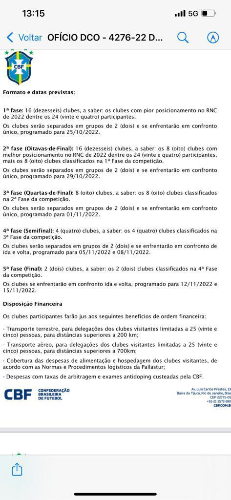 Presidente do Paysandu divulga datas e modelo de disputa da Copa Verde 2022; confira Paysandu, Tuna Luso e Remo são os representantes do Pará na competição, porém, o Remo avalia a situação e não confirmou presença Fábio Will 24.08.22 13h39 Maurício Ettinger enviou um documento ao O Liberal com datas e formato da competição (Fábio Will / O Liberal) A Copa Verde terá a sua nona edição e clubes e federações envolvidas na competição vivem a expectativa das datas e também do formato do torneio, que foi oficializado ontem pela Confederação Brasileira de Futebol (CBF), através de seu site oficial. O presidente da Federação Paraense de Futebol (FPF), Ricardo Gluck Paul, conversou com a equipe de O Liberal e informou que a tabela será divulgada no máximo nesta quinta-feira (25). VEJA MAIS Copa Verde: clubes classificados têm até sexta-feira (26) para confirmar participação no torneio Documento encaminhado às 24 equipes que têm direito a vaga foi encaminhado pela CBF nesta quarta-feira (24). Devem haver desistências Curiosidades Copa Verde: Gol fantasma, primeiro gol da Arena de Copa do Mundo e pênalti bizarro A nova edição da Copa Verde foi confirmada pela CBF e possui várias curiosidades; relembre Tuna Luso mantém trabalho de preparação técnica e garante participação na Copa Verde deste ano Com a confirmação do torneio, os lusos devem reunir para buscar formas de patrocínio que possam garantir o clube em mais uma competição nacional Em uma breve conversa, Ricardo Gluck Paul informou que existe a possibilidade de sair hoje as datas e que aguarda o pronunciamento oficial da CBF. “As datas serão divulgadas hoje ou amanhã. A previsão é iniciar dia 25 de outubro e encerrar antes do início da Copa do Mundo”, disse, Ricardo Gluck Paul. Presidente do Paysandu Porém, o presidente do Paysandu, Maurício Ettinger, encaminhou ao O Liberal um documento com datas e formato da competição. A Copa Verde iniciaria no dia 25 de outubro com 16 equipes, em jogo único. oficialmente a CBF ainda não se pronuciou sobre o assunto. VEJA MAIS Fábio Bentes não confirma presença do Remo na próxima Copa Verde: 'vamos avaliar' Em entrevista ao Núcleo de Esportes de O Liberal, presidente azulino deu detalhes da reunião que decidiu pela realização do torneio Com Paysandu, Remo e Tuna, veja as equipes classificadas para a Copa Verde 2022 Levantamento feito pelo Núcleo de Esportes de O Liberal usou como base o regulamento da competição, disponível no site da Confederação Brasileira de Futebol (CBF) Confira o documento As oitavas de finais entrariam os oito classificados da primeira fase, mais os oito melhores clubes do ranking nacional, que jogam em partida única, programada para o dia 29 de outubro. Nas quartas de finais os oito clubes serão separados em chaves. Cada confronto será único, definindo os semifinalistas. A previsão das partidas é o dia 1 de novembro. Já nas semifinais os confrontos serão no formato ida e volta, programados para os dias 5 e 11 de novembro. As finais da Copa Verde estão previstas os dias 12 e 15 de novembro. Representantes do Pará O Estado do Pará possui três vagas na Copa Verde de 2022. Paysandu por ser o campeão do Campeonato Paraense de 2021, a Tuna Luso, vice-campeã estadual de 2021 e o Clube do Remo, que entrou na competição pelo ranking nacional de clubes da CBF. Assine O Liberal e confira mais conteúdos e colunistas. 🗞 Entre no nosso grupo de notícias no WhatsApp e Telegram 📱 Palavras-chave esportes remo paysandu futebol jornal amazônia copa verde maurício ettinger ricardo gluck paul COMPARTILHE ESSA NOTÍCIA Futebol . Desculpe pela interrupção. Detectamos que você possui um bloqueador de anúncios ativo! Oferecemos notícia e informação de graça, mas produzir conteúdo de qualidade não é. Os anúncios são uma forma de garantir a receita do portal e o pagamento dos profissionais envolvidos. Por favor, desative ou remova o bloqueador de anúncios do seu navegador para continuar sua navegação sem interrupções. Obrigado! ÚLTIMAS EM FUTEBOL JOGOS DE HOJE Futebol: veja quem joga hoje, terça-feira (24/02), horários das partidas e onde assistir ao vivo Série A saudita, Libertadores, Copa do Brasil e Champions League movimentam o futebol nesta terça-feira 24.02.26 7h00 Futebol Com participantes definidos, FPF divulga datas e horários da fase final da Copa Grão-Pará; veja Após a rodada que definiu os finalistas do Parazão, mais dois times foram garantidos na segunda semifinal da competição paralela ao estadual 23.02.26 16h27 Campeonato Inglês Everton x United: onde assistir ao vivo e as escalações do jogo de hoje (23/02) pela Premier League Everton e Manchester United jogam pelo Campeonato Inglês hoje; veja onde assistir ao vivo e as formações da partida 23.02.26 16h00 Campeonato Espanhol Alavés x Girona: onde assistir ao vivo e as escalações do jogo de hoje (23/02) por La Liga Alavés e Girona jogam pelo Campeonato Espanhol hoje; veja onde assistir ao vivo e as formações da partida 23.02.26 16h00 MAIS LIDAS EM ESPORTES JOGOS DE HOJE Futebol: veja quem joga hoje, terça-feira (24/02), horários das partidas e onde assistir ao vivo Série A saudita, Libertadores, Copa do Brasil e Champions League movimentam o futebol nesta terça-feira 24.02.26 7h00 FUTEBOL Dirigente do Remo fala sobre contratações e detalha conversas com zagueiro e meia Lingard Vice-presidente do Remo, Glauber Gonçalves, explicou que existe conversas entre o clube e jogadores, mas que situação depende de uma força-tarefa 23.02.26 16h08 INVIÁVEL Paysandu deve cinco vezes mais do que o declarado na recuperação judicial No pedido aprovado pela justiça, clube declarou dívidas de pouco mais de R$ 16 mi, no entanto, totalidade de débitos chega a quase R$ 75 milhões 24.02.26 8h00 PROMESSAS Belém abriu o calendário nacional do tênis juvenil Reunindo atletas de várias regiões, 1ª Etapa do 