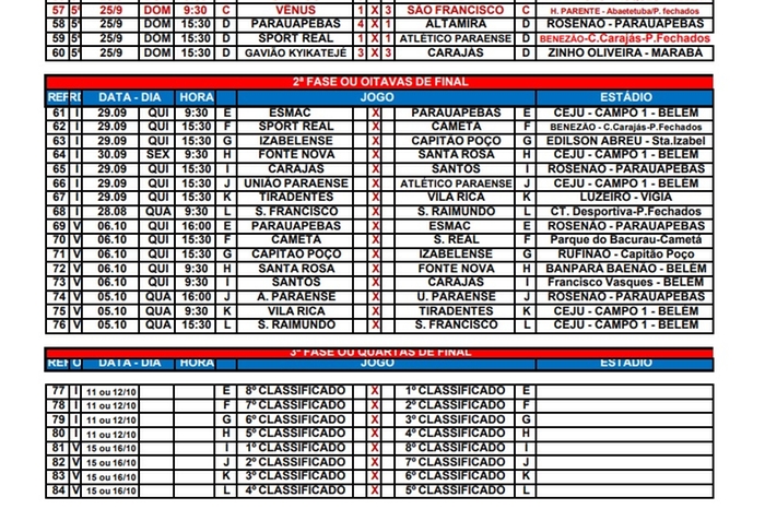 Segundinha encerrou primeira fase com nove jogos no domingo; conheça os classificados e rebaixados Ao todo, 16 equipes prosseguem na luta por quatro vagas na primeira divisão do Parazão do ano que vem; seis times foram rebaixados Luiz Guilherme Ramos 26.09.22 10h28 Neste domingo foram definidos os 16 classificados á próxima fase da Segundinha. (Lenno Costa) O Campeonato Paraense da segunda divisão teve neste domingo o encerramento da primeira fase, com oito jogos realizados pela manhã e tarde, onde foram definidos as 16 equipes classificadas à próxima fase, bem como as equipes que foram rebaixadas para a terceira divisão. As oitavas de finais - ou segunda fase - segue a partir do próximo dia 29 de setembro e vai até o dia 6 de outubro. Neste domingo, nove partidas movimentaram o futebol paraense, com direito a várias goleadas e exibições de gala. Pelo grupo B, o São Raimundo derrotou o Sport Belém por 3 a 1, no Ceju; Fonte Nova e Santa Rosa, no mesmo local, ficaram no 0 a 0, enquanto o Izabelense enfiou 5 a 2 no Grêmio Carajá, em partida realizada no estádio Abreuzão, em Santa Izabel. O grupo C apresentou os maiores placares da rodada, começando pela goleada do União Paraense em cima do Pedreira, no Ceju, por 3 a 0. Quem também não tomou conhecimento do adversário foi o Cametá, que recebeu o Santos no estádio do Souza e enfiou uma lambada de 4 a 0, enquanto o São Francisco foi até Abaetetuba liquidar a fatura do Vênus e vencer por 3 a 1. SAIBA MAIS Chuva e relâmpago interrompem partida pela Segundinha do Parazão no Ceju, em Belém; vídeo Partida foi encerrada no primeiro tempo, quatro minutos antes do tempo estipulado pela arbitragem Segundinha do Parazão: mais duas equipes estão classificadas para o mata-mata do torneio Complemento da rodada teve vitória do São Francisco, além de empate entre Carajás e Parauapebas Segundinha 2022: rodada desta quarta-feira tem mais três classificados e dois rebaixados; veja mais Complemento da quarta rodada será nesta quinta-feira, com dois jogos: São Francisco e União Paraense jogam no CT da Desportiva e Carajás e Parauapebas se enfrentam no Rosenão Os outros três jogos aconteceram pelo grupo D. No estádio Rosenão, o Parauapebas goleou o Altamira pelo placar de 4 a 1; no Benezão, Sport Real e Atlético-PA ficaram no 1 a 1, enquanto Gavião Kykatejê e Carajá também empataram, em 3 a 3, no estádio Zinho Oliveira, na cidade de Marabá. Confira aqui os próximos jogos das oitavas de finais da Segundinha: Próximos jogos da Segundinha 2022. (Reprodução) Rebaixados para a Série C do Campeonato Paraense: - Grêmio Carajás - Altamira - Paraense - Vênus - Pedreira - Pinheirense Assine O Liberal e confira mais conteúdos e colunistas. 🗞 Entre no nosso grupo de notícias no WhatsApp e Telegram 📱 COMPARTILHE ESSA NOTÍCIA Futebol . Desculpe pela interrupção. Detectamos que você possui um bloqueador de anúncios ativo! Oferecemos notícia e informação de graça, mas produzir conteúdo de qualidade não é. Os anúncios são uma forma de garantir a receita do portal e o pagamento dos profissionais envolvidos. Por favor, desative ou remova o bloqueador de anúncios do seu navegador para continuar sua navegação sem interrupções. Obrigado! ÚLTIMAS EM FUTEBOL Futebol Com participantes definidos, FPF divulga datas e horários da fase final da Copa Grão-Pará; veja Após a rodada que definiu os finalistas do Parazão, mais dois times foram garantidos na segunda semifinal da competição paralela ao estadual 23.02.26 16h27 Campeonato Inglês Everton x United: onde assistir ao vivo e as escalações do jogo de hoje (23/02) pela Premier League Everton e Manchester United jogam pelo Campeonato Inglês hoje; veja onde assistir ao vivo e as formações da partida 23.02.26 16h00 Campeonato Espanhol Alavés x Girona: onde assistir ao vivo e as escalações do jogo de hoje (23/02) por La Liga Alavés e Girona jogam pelo Campeonato Espanhol hoje; veja onde assistir ao vivo e as formações da partida 23.02.26 16h00 Série A italiana Bologna x Udinese: onde assistir ao vivo e escalações do jogo hoje (23/02) pelo Campeonato Italiano Bologna e Udinese jogam pela Série A italiana hoje; veja onde assistir ao vivo e as formações da partida 23.02.26 15h45 MAIS LIDAS EM ESPORTES PROMESSAS Belém abriu o calendário nacional do tênis juvenil Reunindo atletas de várias regiões, 1ª Etapa do Nacional Juvenil 2026 reforça a presença da região Norte no calendário nacional da modalidade 24.02.26 0h21 FUTEBOL De olho na Série A, Remo exerce poder de compra e fecha a contratação de atacante Atacante Jajá estava no Goiás e desembarcou em Belém para se apresentar ao Leão Azul 23.02.26 13h15 PARAZÃO Patrick de Paula fala sobre gol salvador que colocou Remo na final: 'único na minha vida' Jogador marcou um golaço nos acréscimos e sacramentou a virada remista contra o Cametá 23.02.26 20h57 Futebol Paysandu conhece tabela básica da Série C 2026; estreia será contra o Volta Redonda em abril CBF divulga calendário da competição, que será disputada entre 5 de abril e 25 de outubro e marca a última edição no formato atual com 20 clubes 23.02.26 16h51