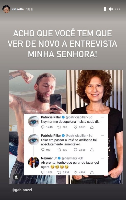 Postando prints dos comentários de Patricia e a própria resposta do Neymar, Rafaella disse: "Acho que você tem que ver de novo a entrevista minha senhora!", veja: