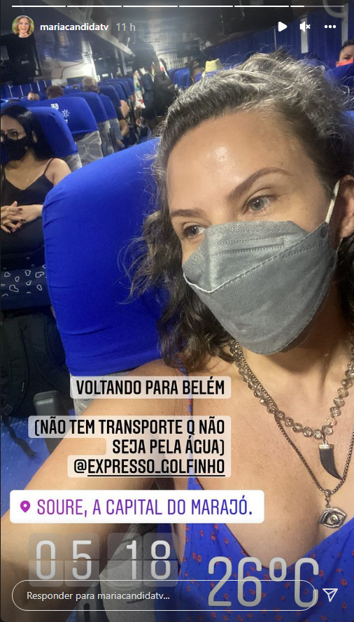 Nos Stories, a jornalista publicou uma foto na manhã desta segunda-feira, ainda em Soure, voltando para Belém, em um expresso aquático. Na legenda, ela escreveu que este é o único meio de transporte da ilha.
